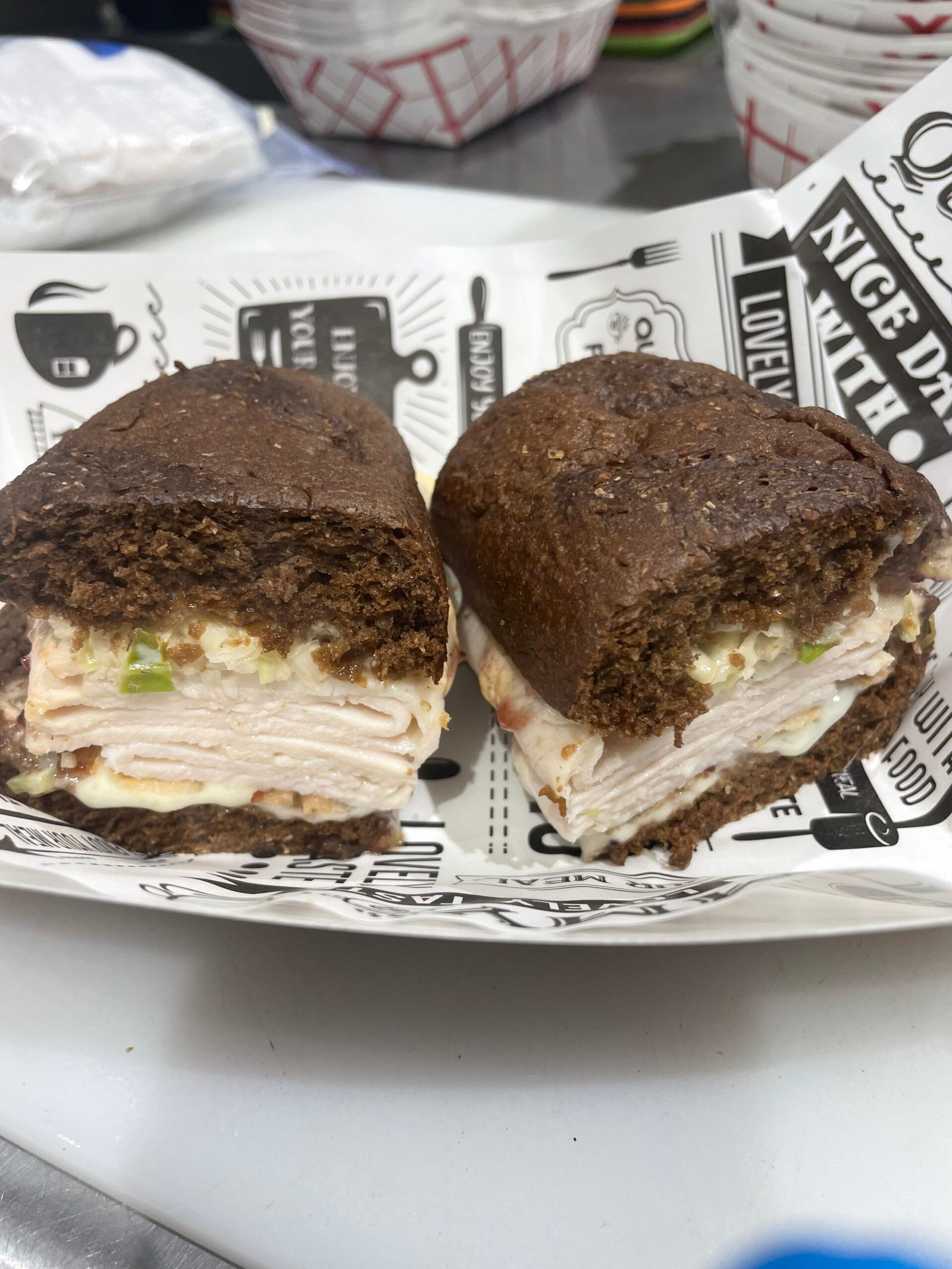 Turkey, bacon, provolone, 1000 island dressing, cranberry relish, & slaw on a dark wheat roll.