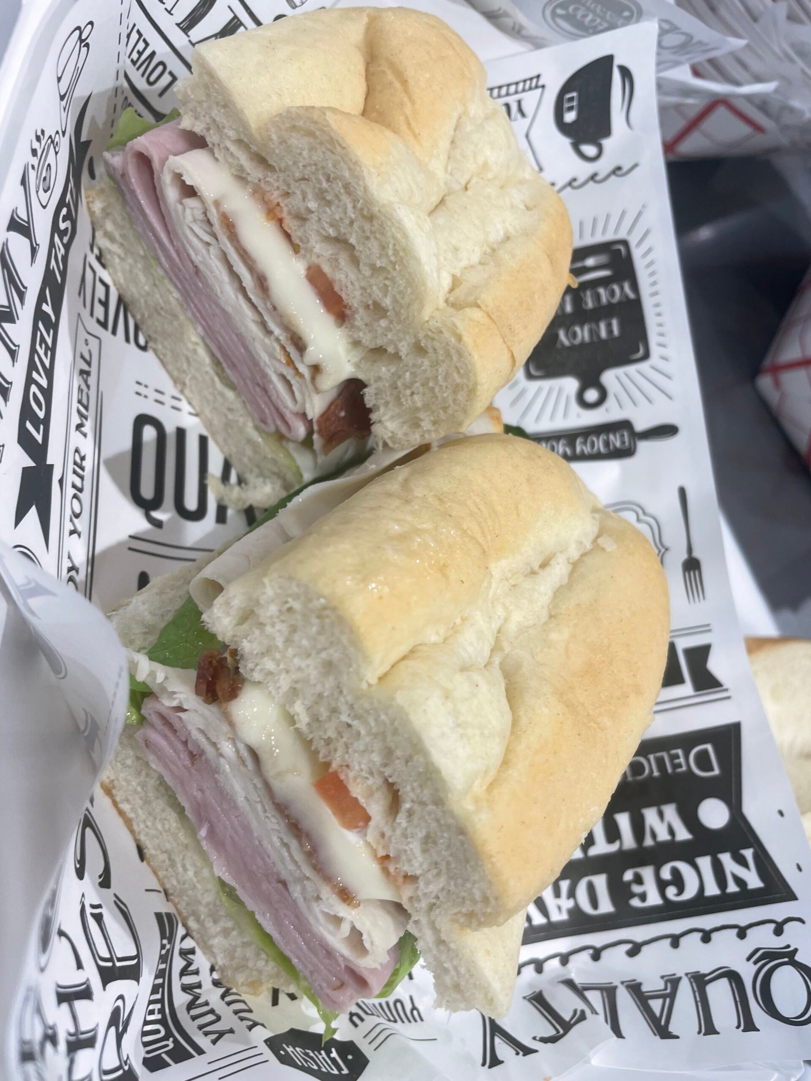 Ham, turkey, bacon, American cheese, lettuce, tomato, mustard mayo blend on a white sub roll.